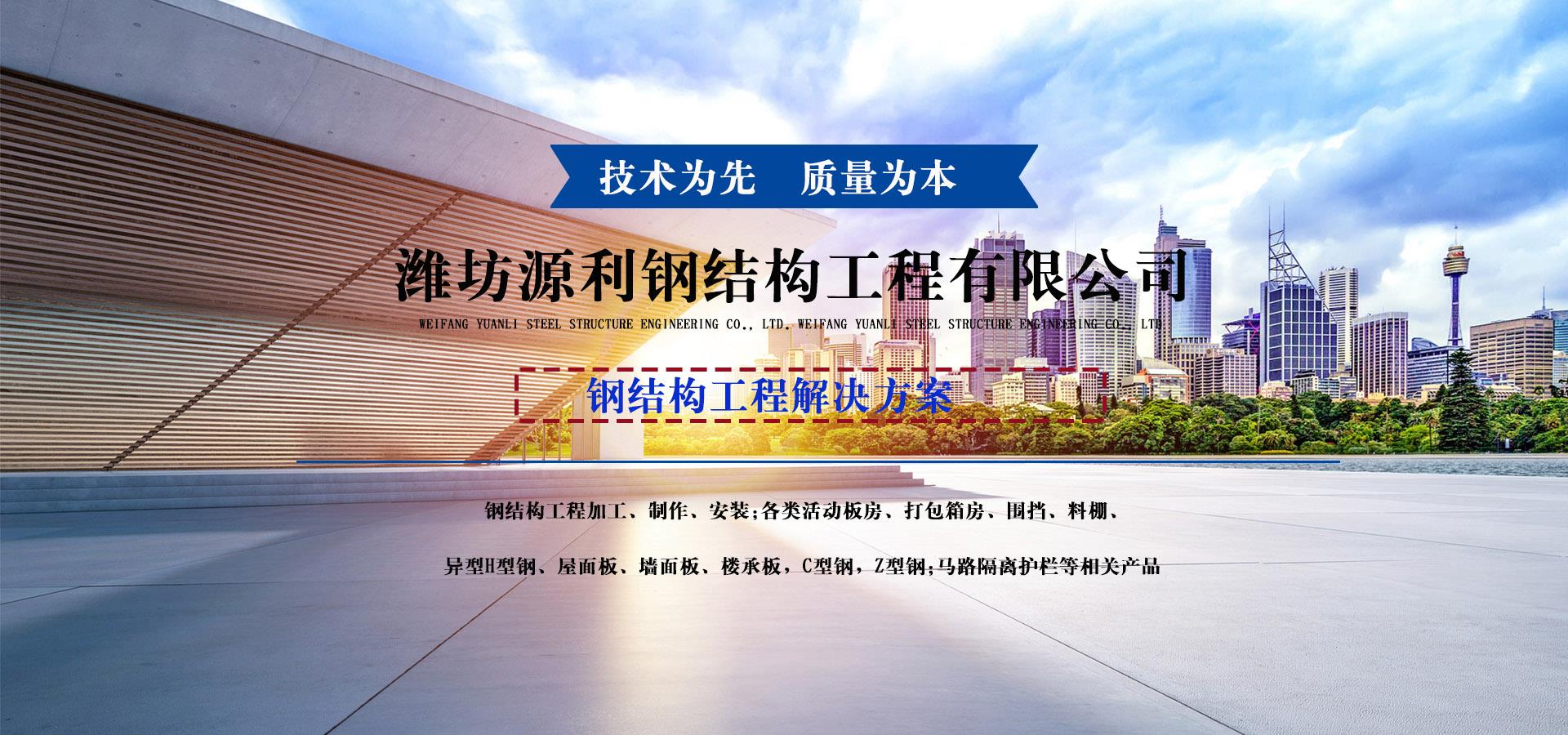 濰坊源利鋼結(jié)構(gòu)工程有限公司成立于2015年,是一家從事活動房屋,鋼結(jié)構(gòu)設(shè)計(jì)、制作、安裝為一體的公司。公司坐落于風(fēng)景秀麗的藍(lán)寶石之鄉(xiāng)昌樂開發(fā)區(qū),占地約60畝,年加工生產(chǎn)能力到40萬平米,現(xiàn)已發(fā)展成本地較大的鋼結(jié)構(gòu)企業(yè),同時(shí)也已跨入集成房屋研發(fā)、推廣企業(yè)行列。公司配備了全套的箱房流水線生產(chǎn)設(shè)備,包含了全自動冷彎成型設(shè)備、流水自動涂裝線、沖壓型材生產(chǎn)線以及全套的配套設(shè)備,標(biāo)準(zhǔn)化、模具化生產(chǎn)加工,年生產(chǎn)5000套打包箱,產(chǎn)品保障。 公司主要產(chǎn)品有:鋼結(jié)構(gòu)工程加工、制作、安裝;各類活動板房、打包箱房、裝配式箱房、折疊箱房、圍擋、料棚、異型H型鋼、屋面板、墻面板、樓承板,C型鋼,Z型鋼;馬路隔離護(hù)欄等相關(guān)產(chǎn)品。